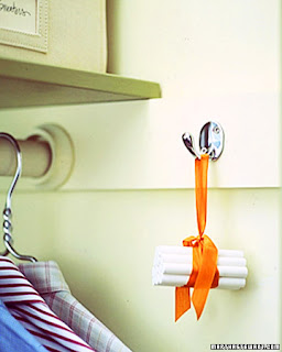 Using regular chalk to keep mildew out of the closets and draws (I have started putting a few sticks in a few of our shoes as well). I first heard this idea on a radio program with Shannon Lush, and have now found it again on Martha Stewart. I am not sure my chalk bundles will look this stylish, but I will give it a try.
